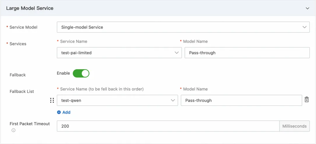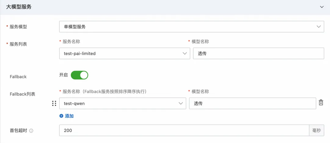 在刚刚创建的 Model API 点击编辑,在大模型服务配置最下面配置首包超时时间为 200ms,表示首包时间超过 200ms 时会触发超时,并返回请求失败。