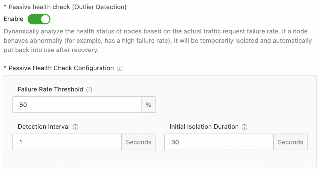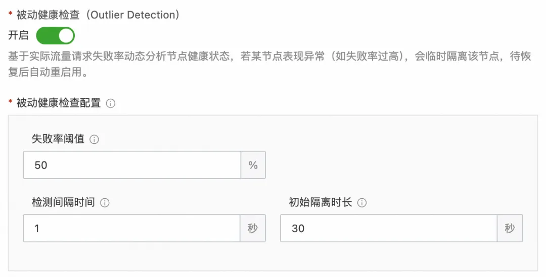 首先在刚刚创建的服务选择健康检查配置,选择开启被动健康检查,然后将失败率阈值配置为 50,表示服务节点请求失败率达到 50% 会被标记为故障节点并移除,检测间隔时间配置为 1s,表示每 1s 计算一次请求失败率,基础弹出时间配置为 30s,表示节点被移除的基础时间为 30s。