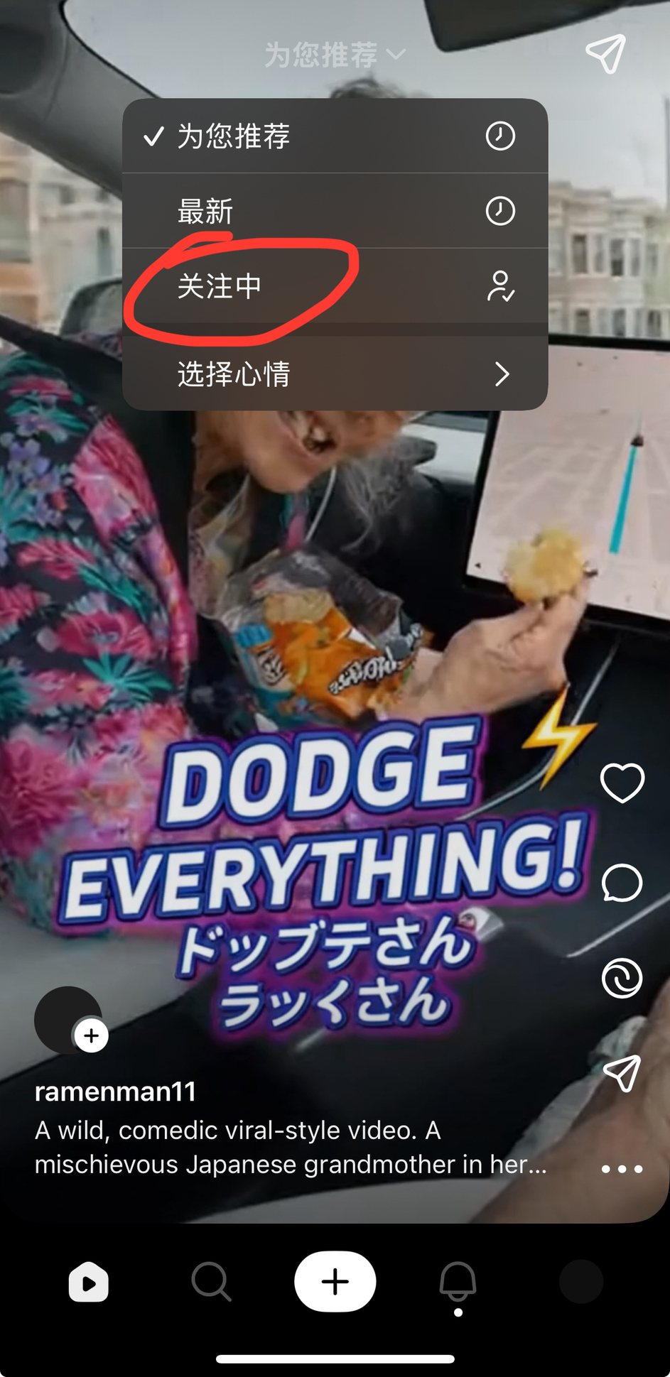 为了给用户更多选择,Sora App 还提供了一个独立的、永远可用的「关注」信息流。在这个页面里,你只会看到你所关注的人发布的内容,没有任何算法推荐的干扰,保证了信息来源的纯粹性。