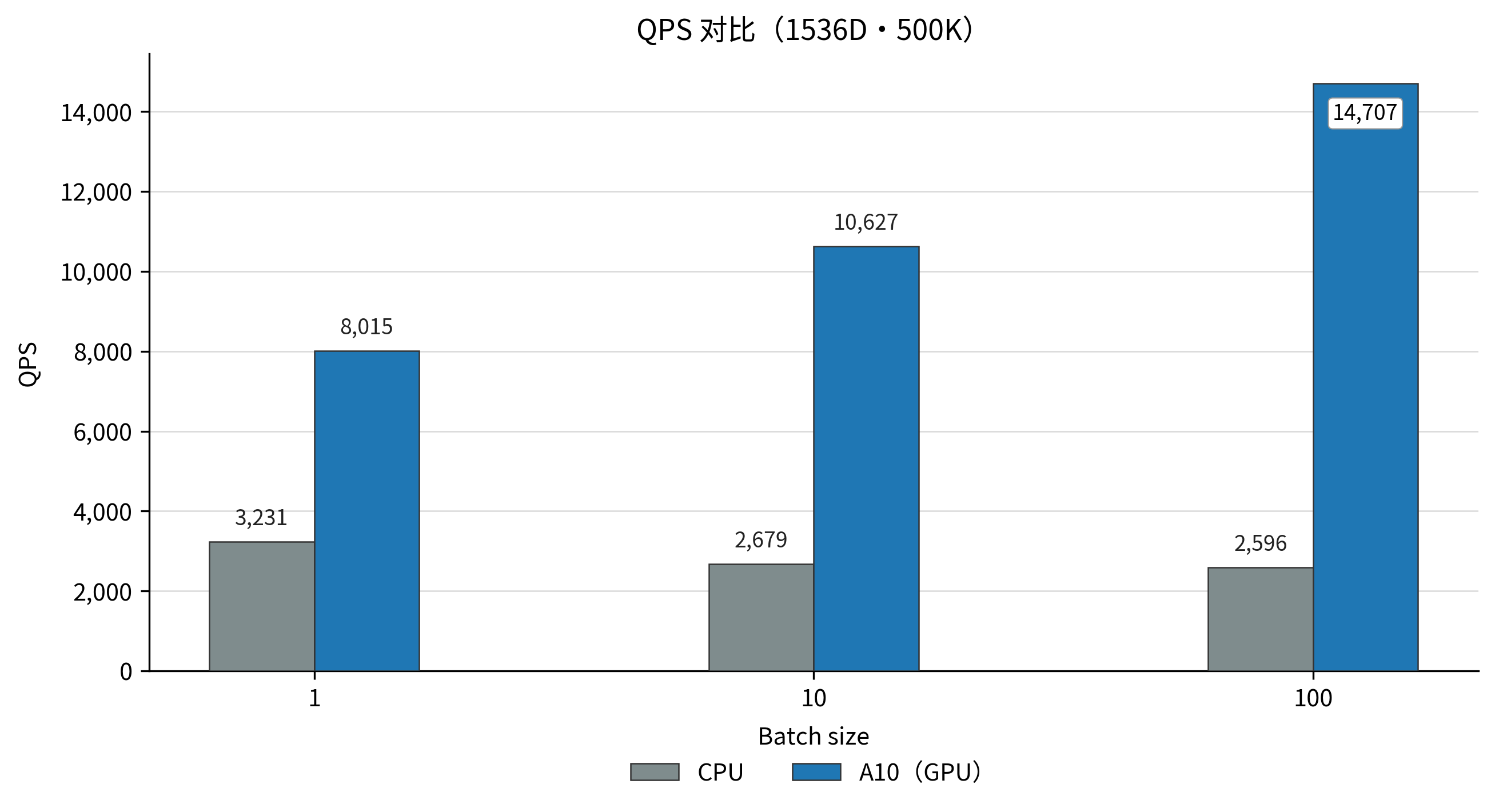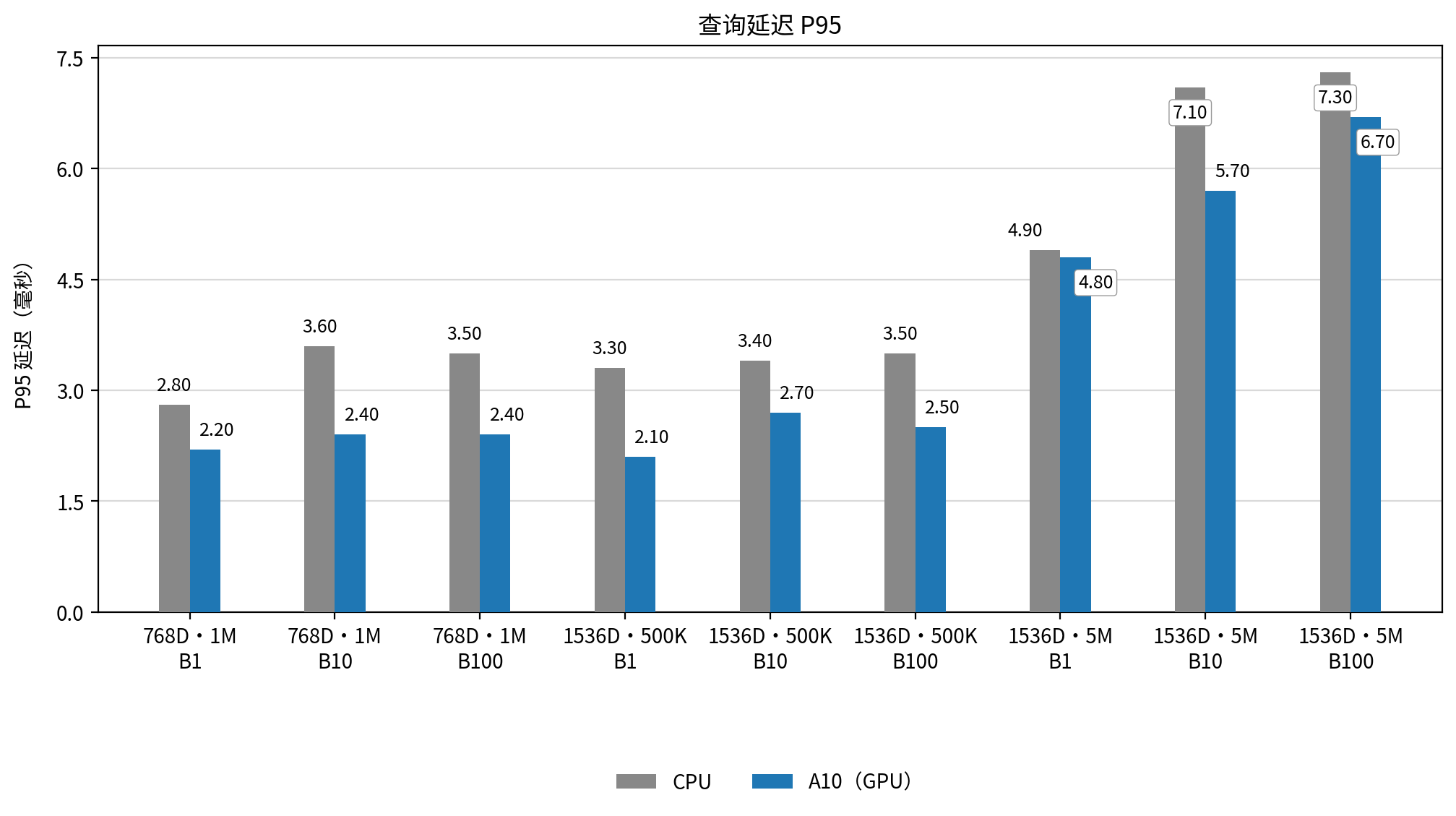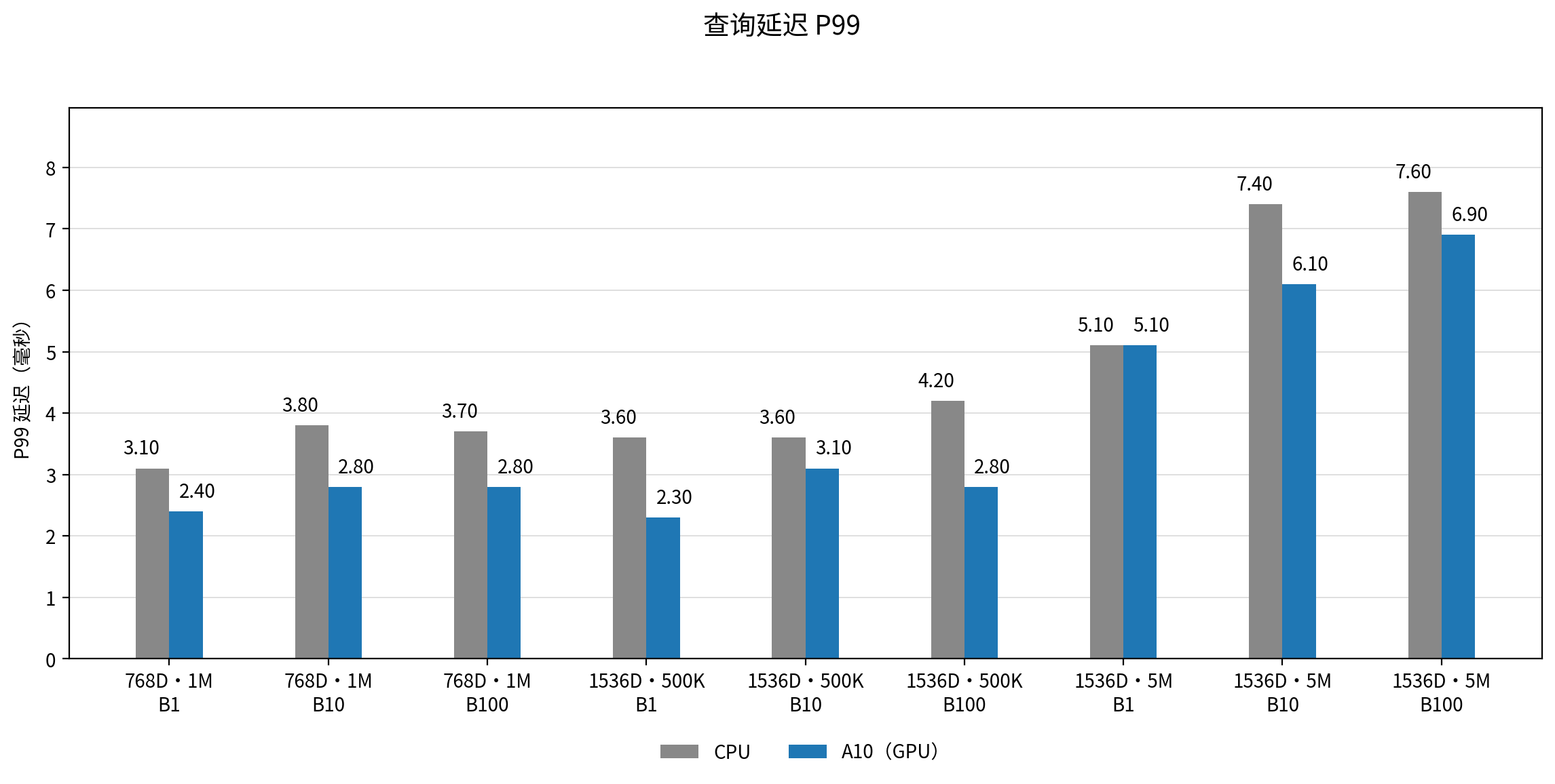查询延迟更低且更稳定:所有测试场景下,GPU 的 P99 和 P95 延迟均显著低于 CPU,提供了更可靠的服务质量保障。
