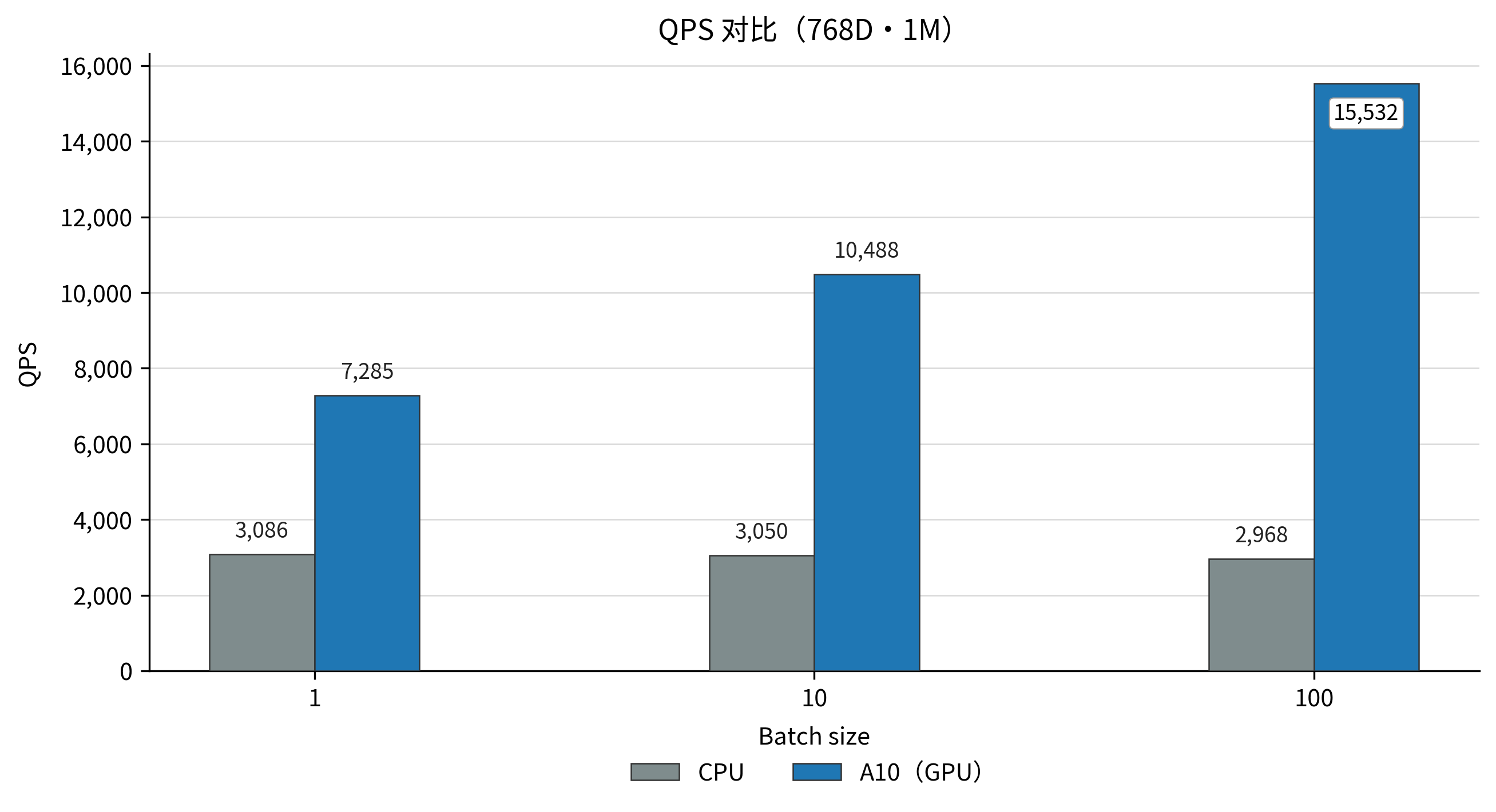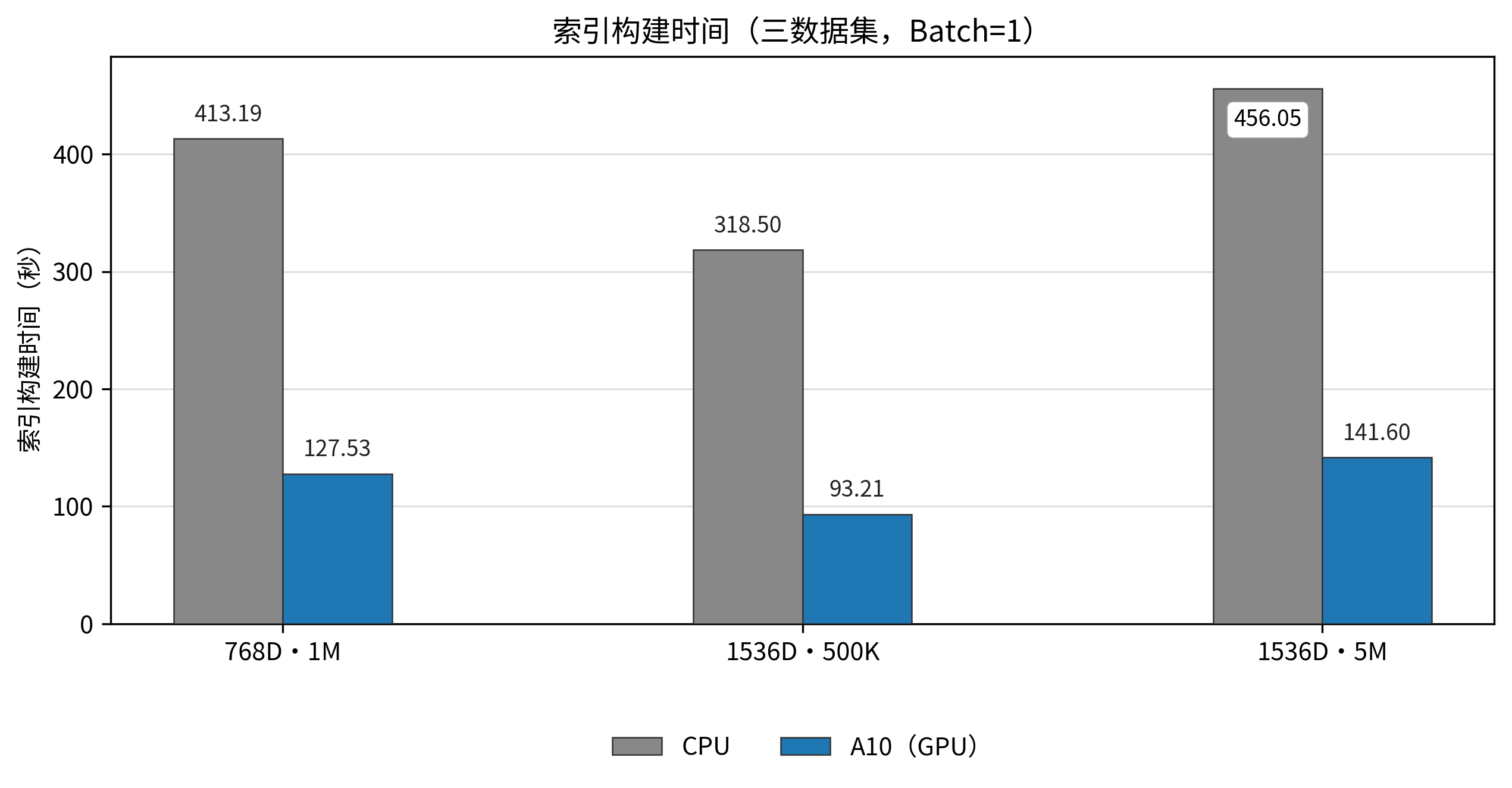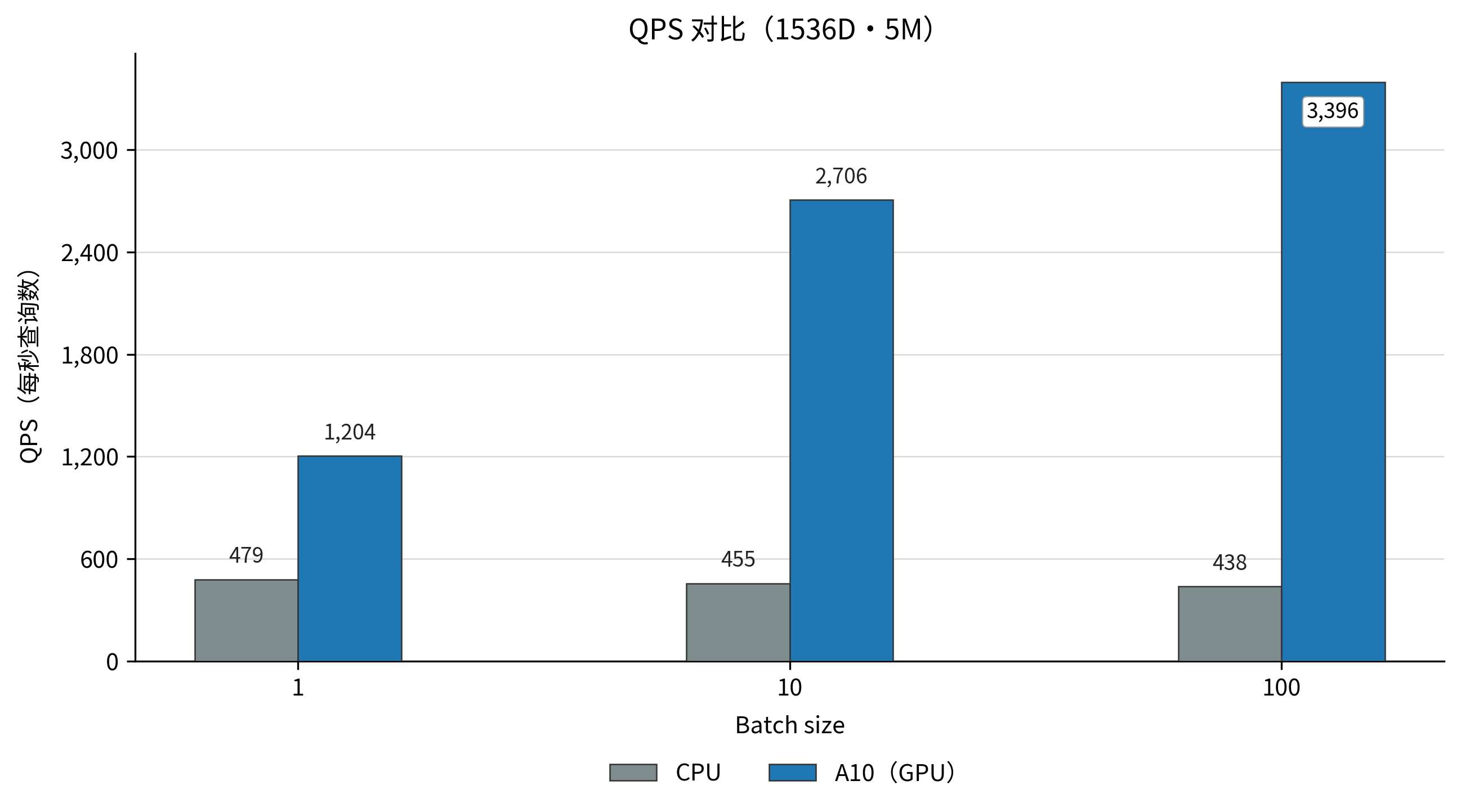 查询延迟更低且更稳定:所有测试场景下,GPU 的 P99 和 P95 延迟均显著低于 CPU,提供了更可靠的服务质量保障。
