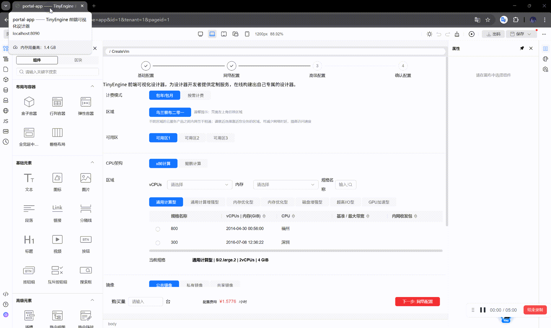 打开第一个窗口: 在您的浏览器(推荐 Chrome)中打开上一步获取的地址,例如 http://localhost:7007。您会看到 tiny-engine 的低代码设计器界面。这就是我们的用户 A。