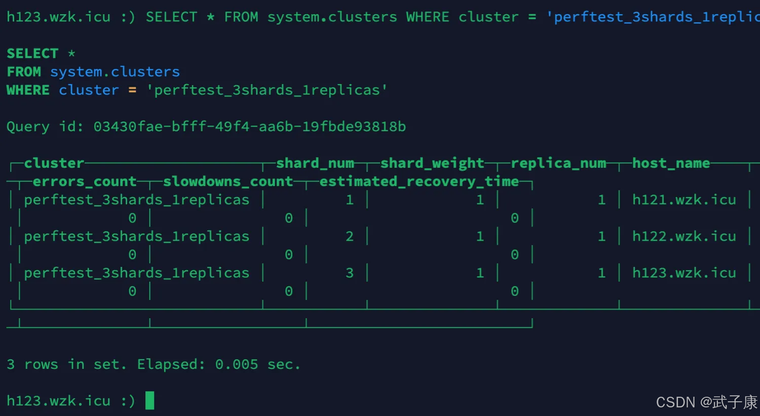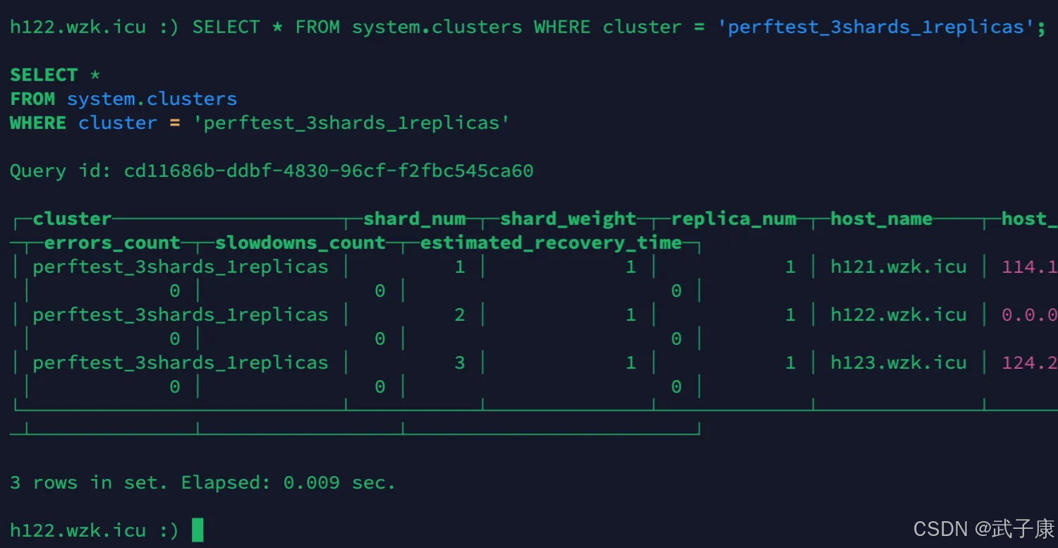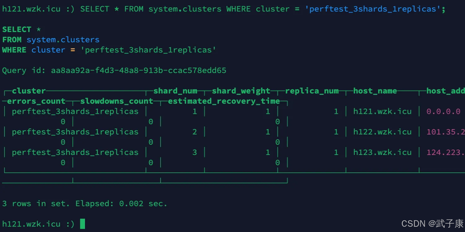 结论:按本文 SOP,一条脚本跑完连通性检查 → 创建 ReplicatedMergeTree/Distributed → 跨分片写读压测。