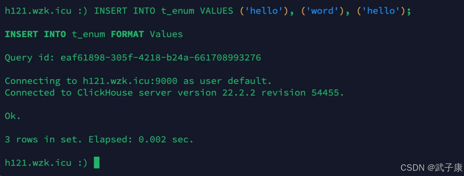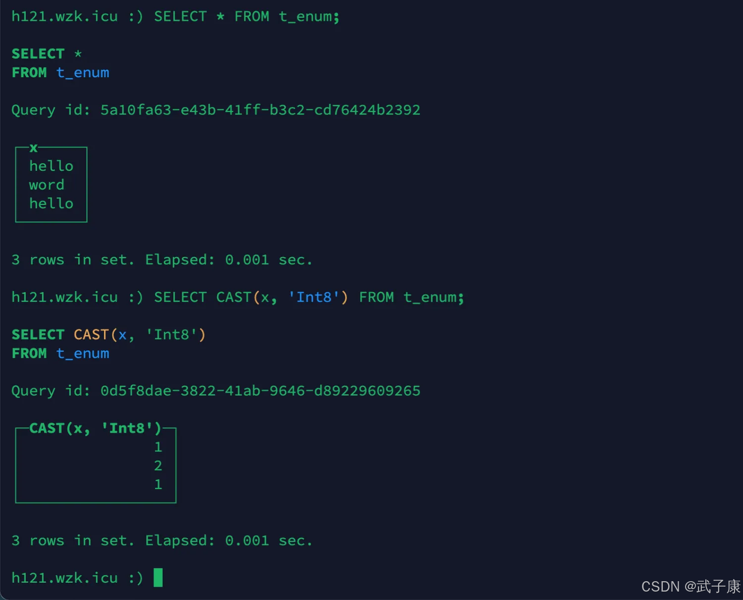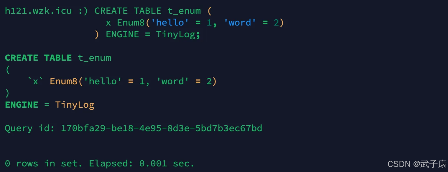 注意:这个列 x 只能存储定义列出的值,“Hello” 或者 “world”,如果插入其他值则会报错。