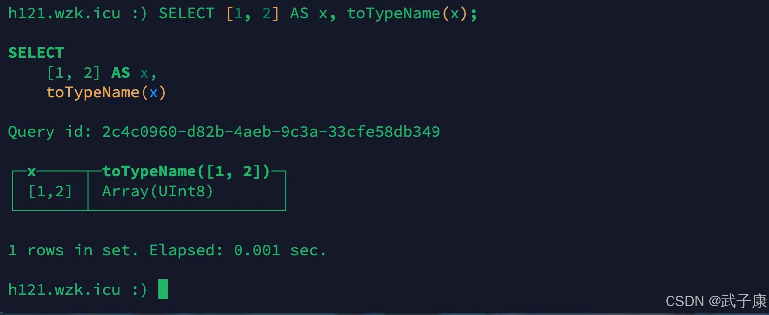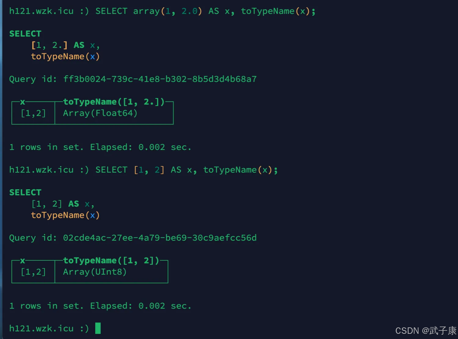 Array(T):由 T 类型元素组成的数组。T 可以是任意类型,包含数组类型,但不推荐使用多维数组,ClickHouse 对多维数组的支持有限。例如,不能再 MergeTree 表中存储多维数组。
