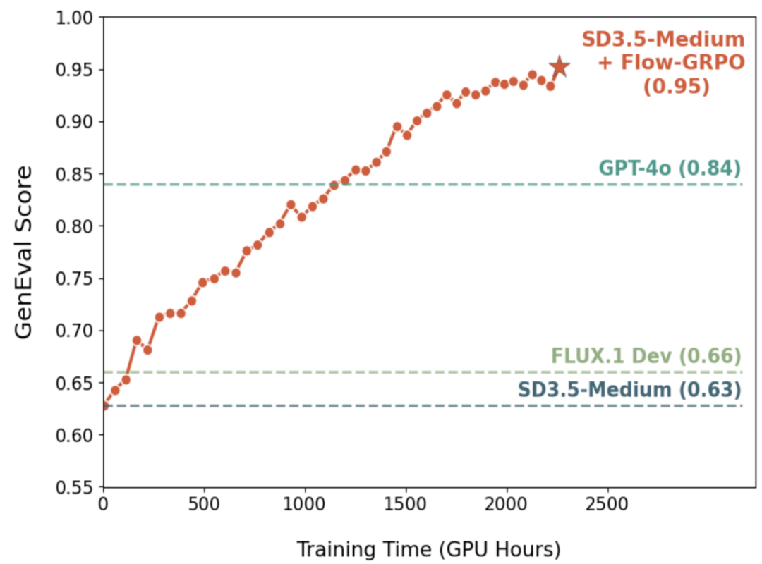 为此,港中文 MMLab、清华大学、快手可灵等团队联合提出 Flow-GRPO,首个将在线强化学习引入 Flow Matching 模型的开创性工作。在 Flow-GRPO 加持下,SD3.5-Medium 在 GenEval 基准测试中的准确率从 63%提升到 95%,在该基准上甚至超越了 GPT-4o,这说明流匹配模型仍具有巨大的提升空间可以被激发。