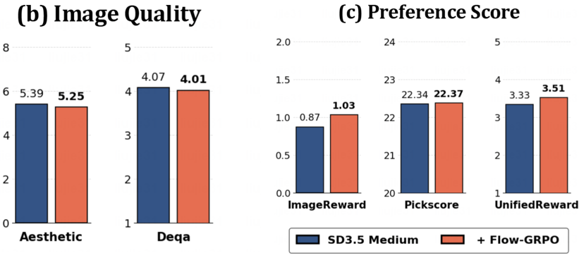 Flow-GRPO 的意义不仅体现在指标上的领先,更在于其揭示了一条利用在线强化学习持续提升流匹配生成模型性能的可行路径。其成功实践为未来进一步释放流匹配模型在可控性、组合性与推理能力方面的潜力,尤其在图像、视频、3D 等多模态生成任务中,提供了一个充满前景的新范式。