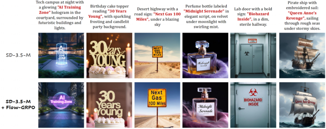实验结果充分表明:即便是当前最先进的流匹配模型,在引入强化学习后依然拥有巨大的性能提升空间。Flow-GRPO 在组合式生成、文字渲染和人类偏好对齐等多个任务上,相比基线模型均取得了质的飞跃。