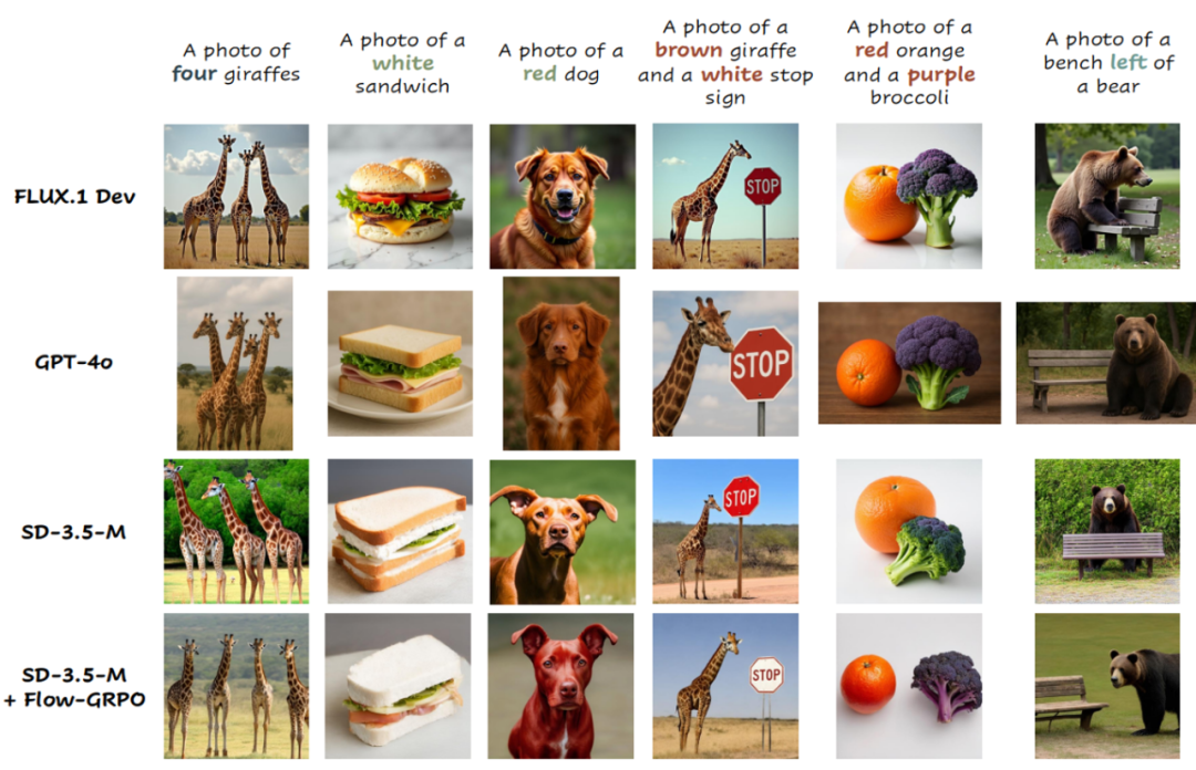 流匹配模型因其坚实的理论基础和在生成高质量图像方面的优异性能,已成为图像生成(SD, Flux)和视频生成(Sora,WanX,HunyuanVideo)领域最先进模型的训练方法。然而,即便是这些业界领先的模型,在处理包含多个物体、复杂属性关系的场景,以及文本渲染等任务时,仍然面临显著挑战。与此同时,在线强化学习凭借其高效的探索与反馈机制,在大语言模型领域已取得令人瞩目的进展,但其在图像生成领域的应用仍处于早期探索阶段。