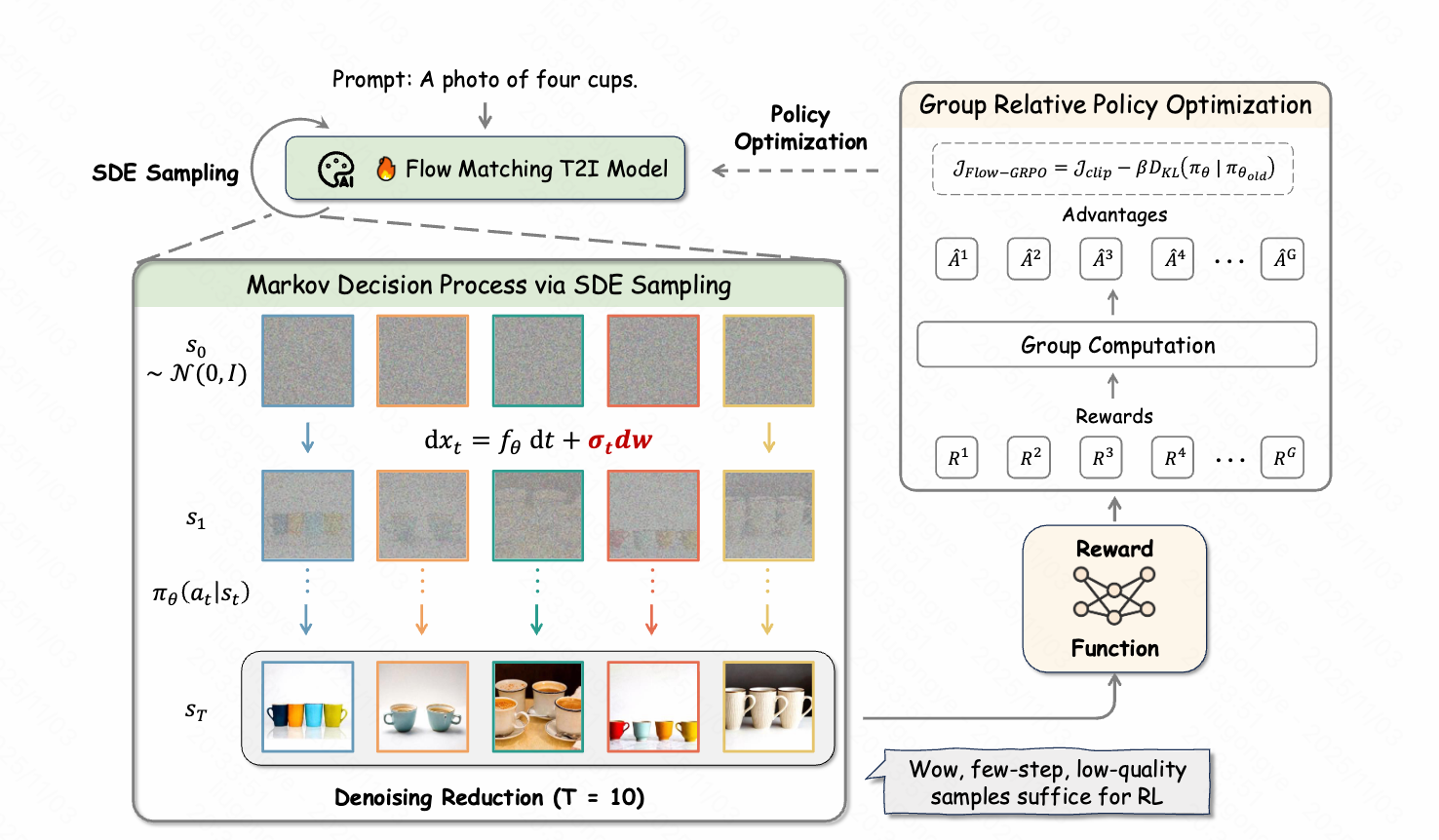 作为首个将在线强化学习成功引入流匹配模型的算法,Flow-GRPO 通过将流模型的确定性采样机制巧妙转化为随机微分方程(SDE)采样,并创新性地引入 Denoising Reduction 技术,实现了在流匹配模型上的高效在线强化学习。