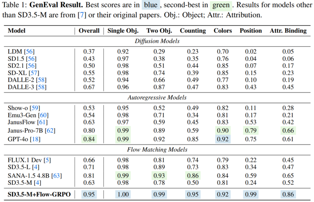 在 GenEval 基准测试中,将 SD3.5-M 的准确率从 63% 提升至 95%,在物体计数、空间关系理解、属性绑定等多个维度达到近乎完美的水平,在该评测榜单上效果超越 GPT-4o!