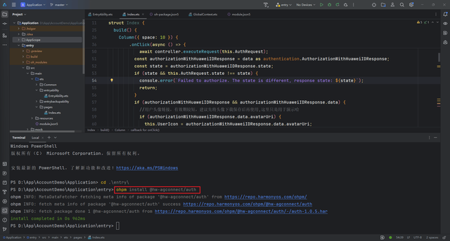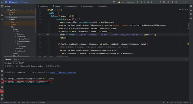 · 在项目的 Terminal 中,把地址切换到 entry 文件夹