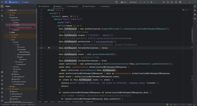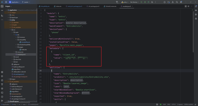 · 配置 Client ID,在 entry 模块的“module.json5”文件中,新增 metadata,配置 name 为 client_id,value 为 AGC 中获取的 Client ID 的值。