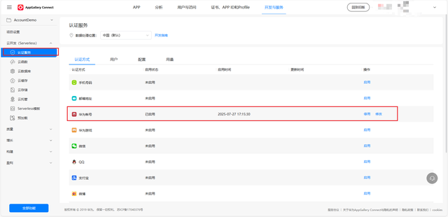 · 认证服务开启华为账号认证(现在手机号码认证需要自己购买第三方服务的形式),这里需要填写 Client ID 和 Client Secret