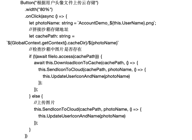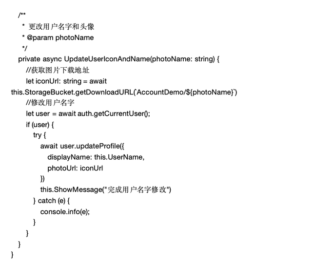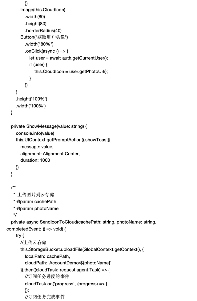 将头像上传到云存储的固定文件夹目录中,然后通过 StorageBucket.getDownloadURL 方法,获取图片的下载路径,下面仅展示关键代码