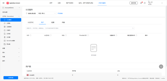 登录账号,并完成云服务的初始化。登录方式有很多种,这里选择华为账号登录登录创建用户为了方便演示作用。