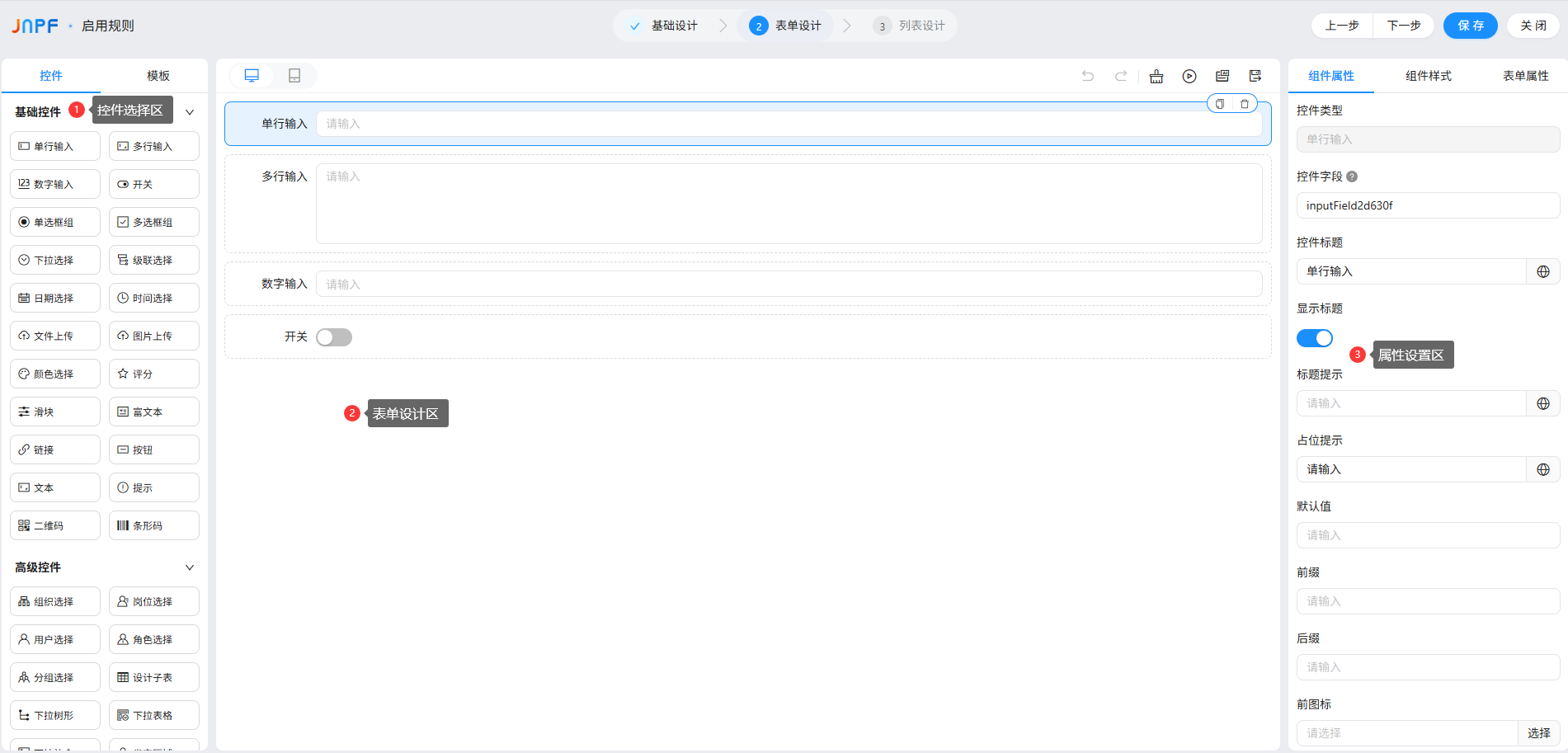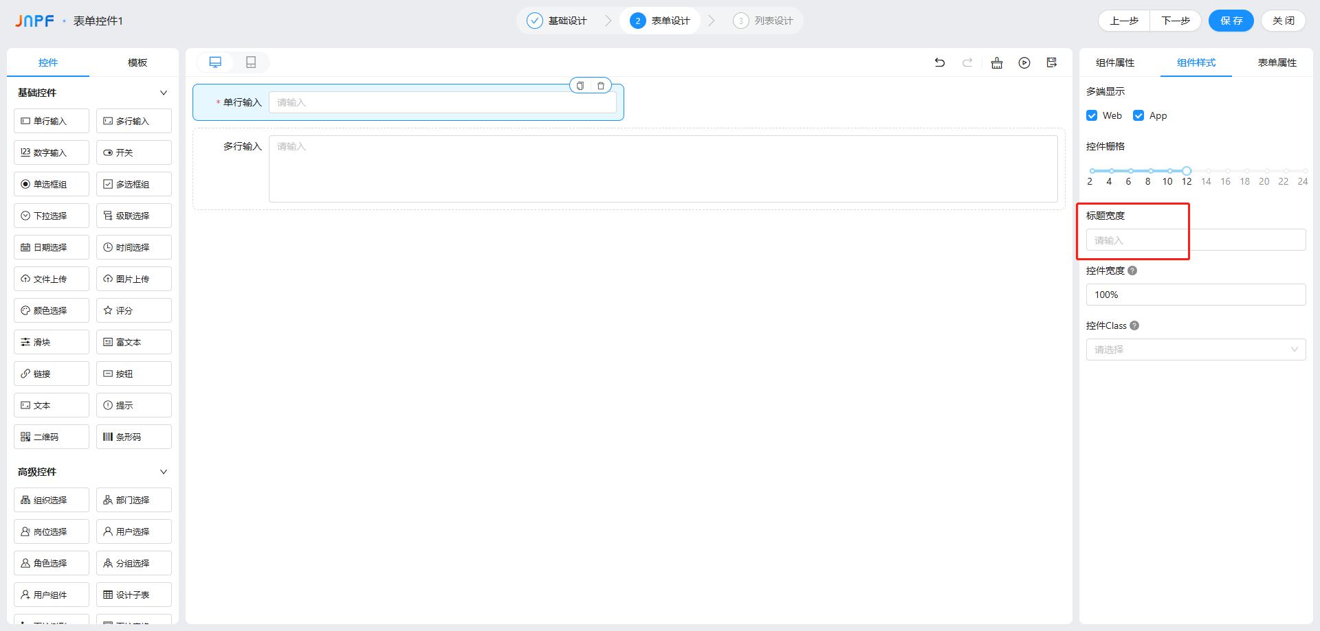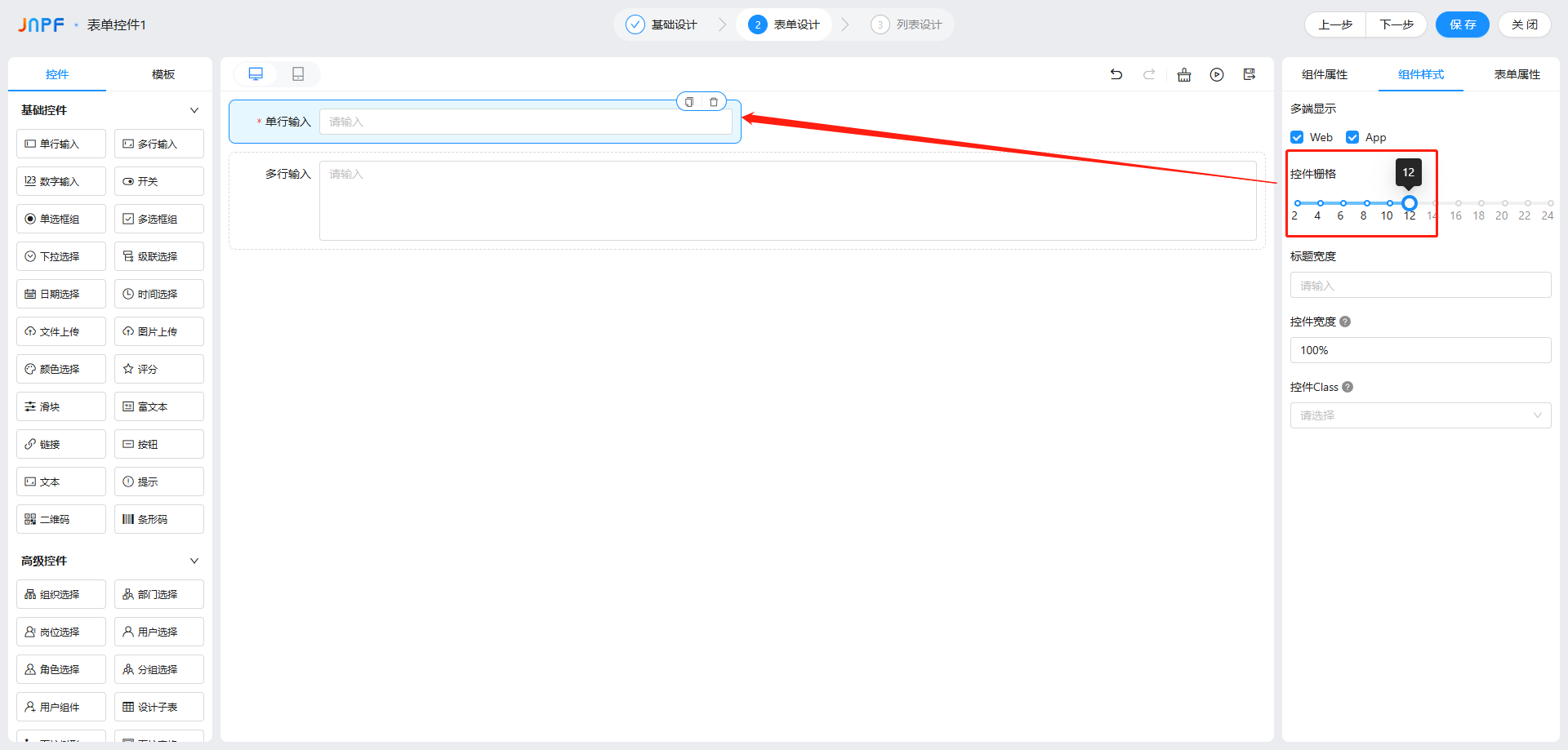 控件栅格:调整控件宽度,最小 2 格、最大 24 格(全屏),比如 “单行输入” 设 4 格,“日期选择” 设 6 格,实现多控件分栏展示,优化 PC 端布局。