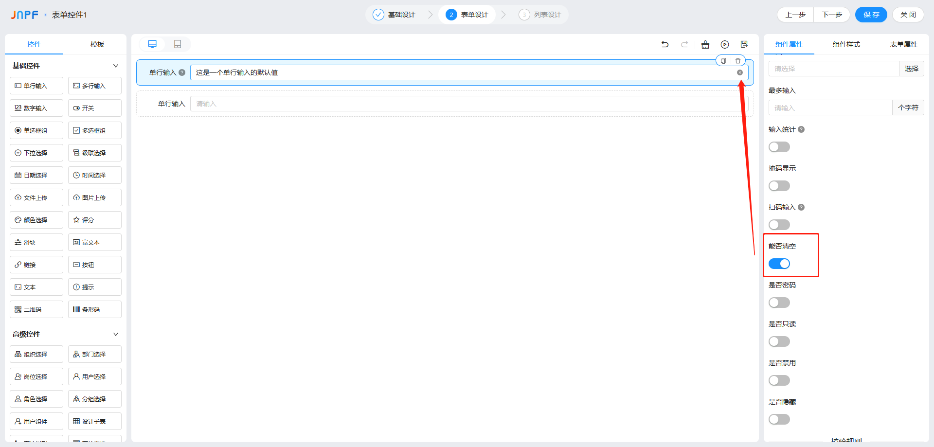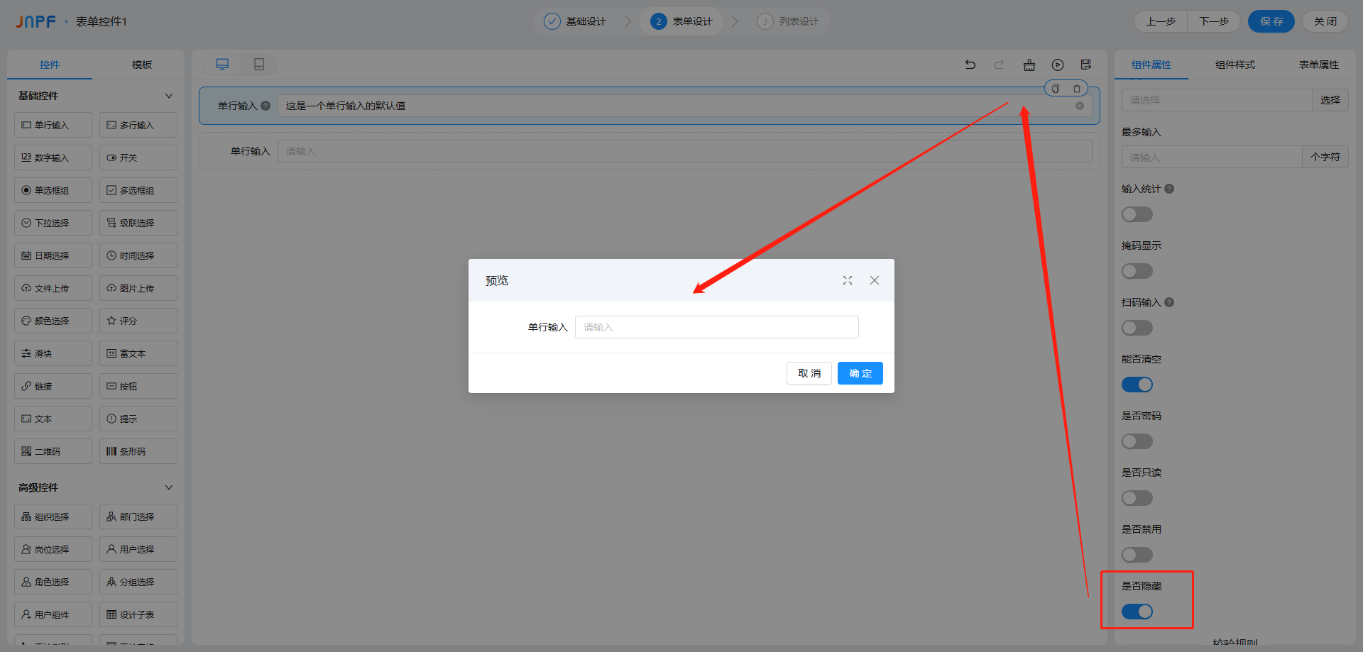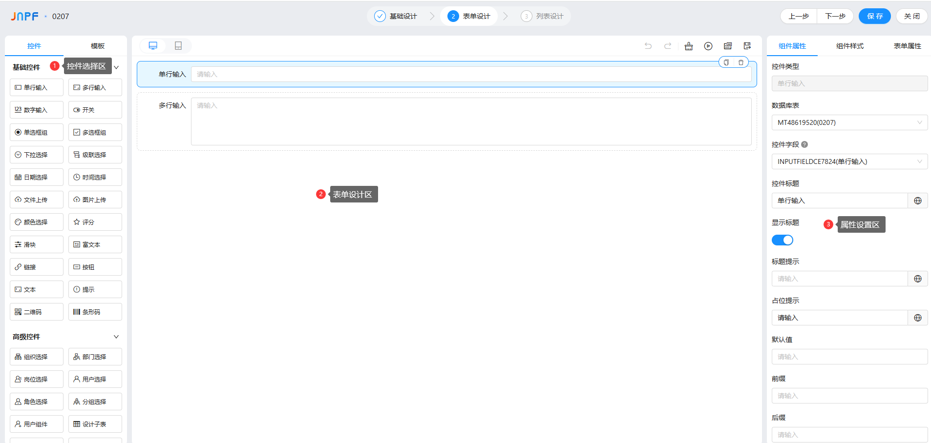 控件栅格:调整控件宽度,最小 2 格、最大 24 格(全屏),比如 “单行输入” 设 4 格,“日期选择” 设 6 格,实现多控件分栏展示,优化 PC 端布局。