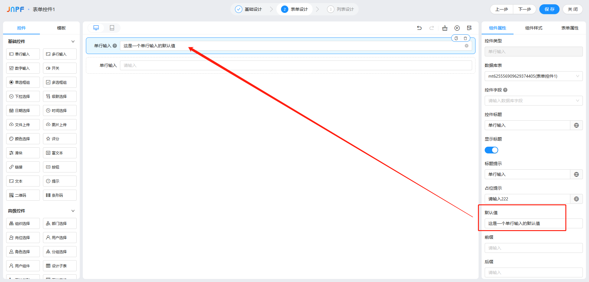 默认值:控件的初始值(如 “日期选择” 默认今天,“单行输入” 默认 “待填写”),用户可手动修改,适合固定初始值场景(如 “所属部门” 默认当前用户部门)。
