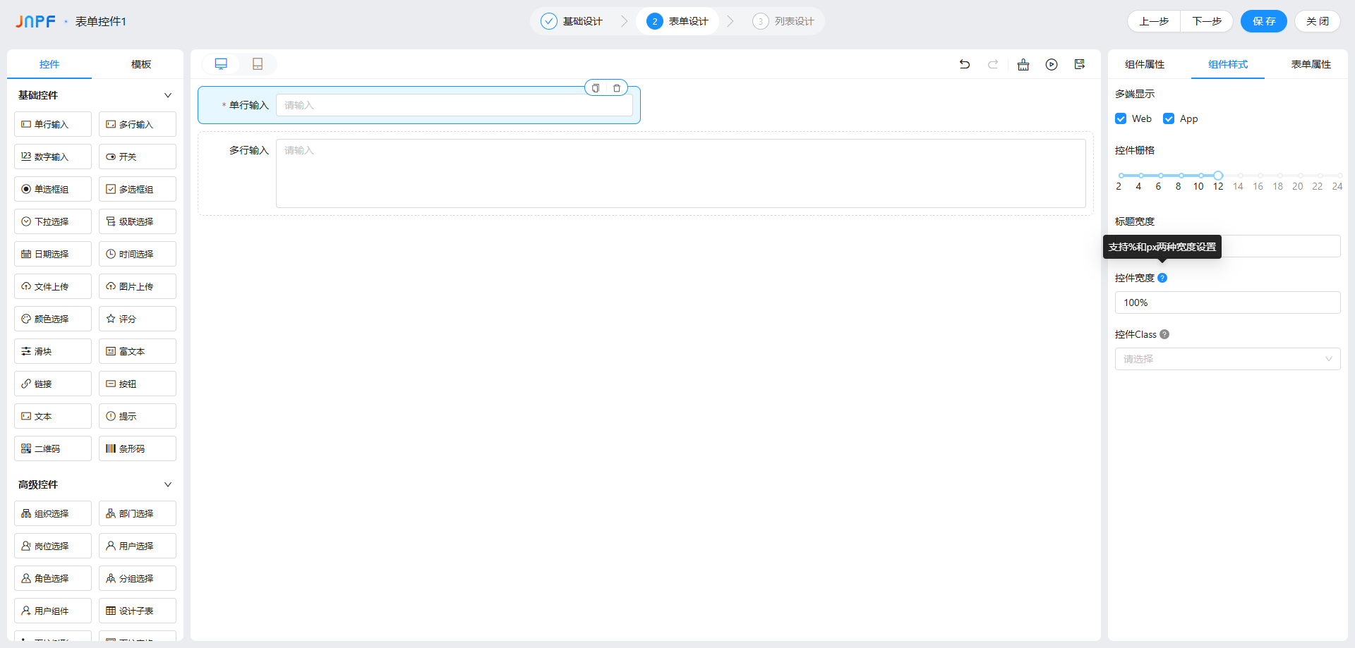 控件宽度:支持 “%” 和 “px”(如 PC 端 “手机号” 设 300px,APP 端设 100% 适配屏幕)。