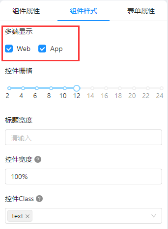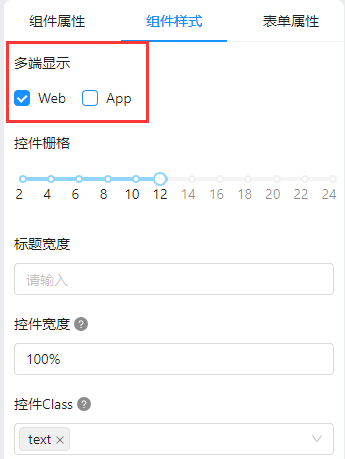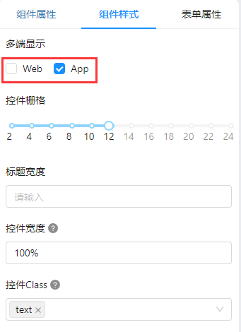 控件在 APP 端显示错乱?优先检查 “多端显示” 是否设为 “仅 Web”,再确认控件宽度是否用 “%” 单位(APP 端用固定 px 易超出屏幕),栅格建议设为 24 格(全屏),避免分栏导致错乱。