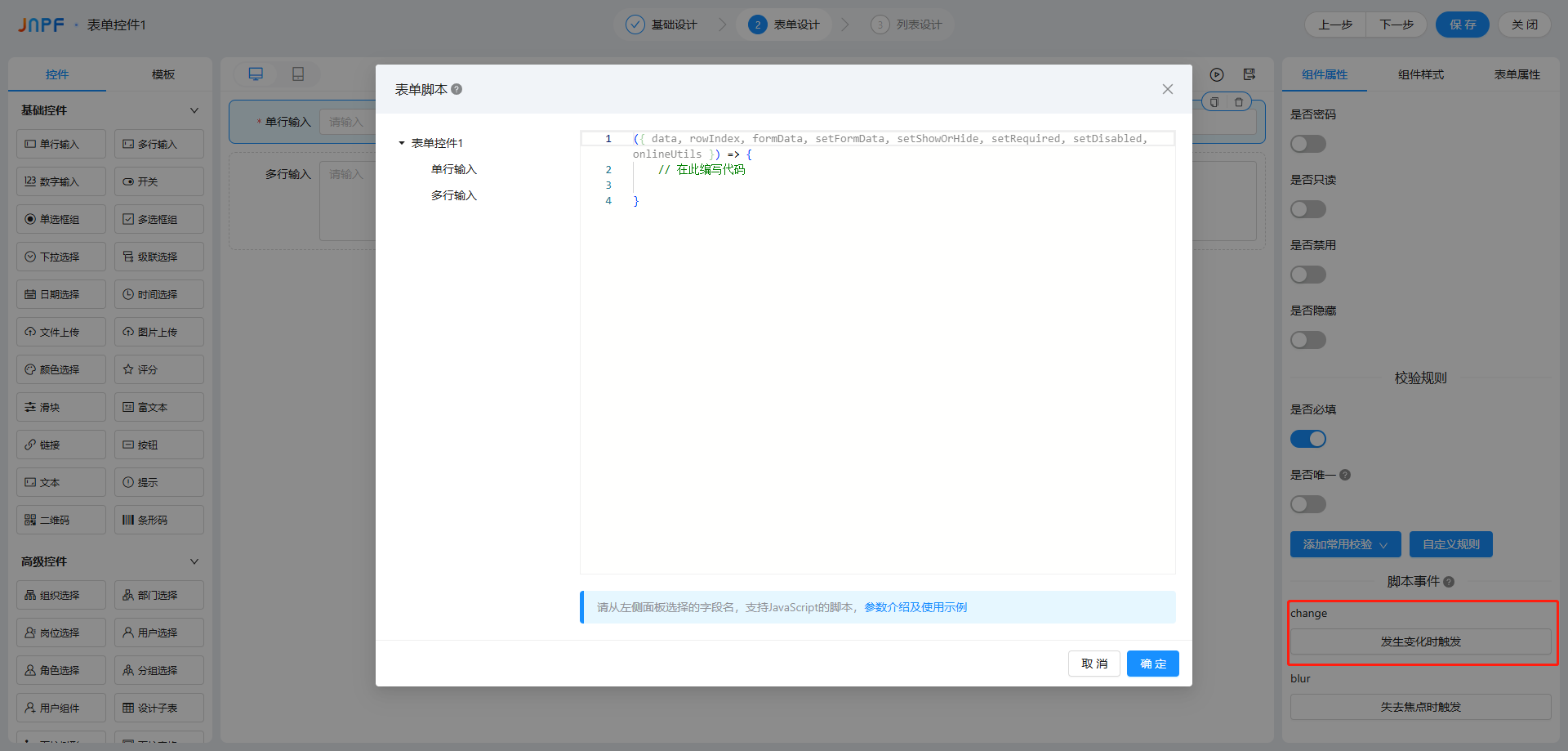 change 事件:控件值变化时触发(如输入手机号后实时校验格式,脚本示例: