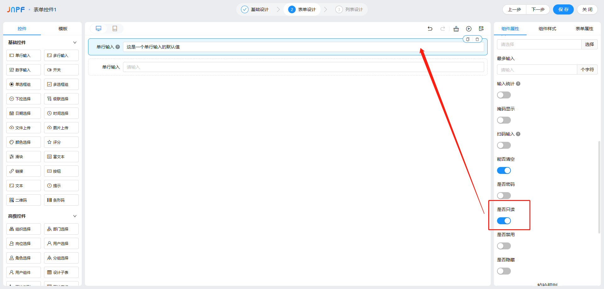 只读:仅 PC 端有效,APP 端无效,适合展示不可改数据(如 “创建时间”);