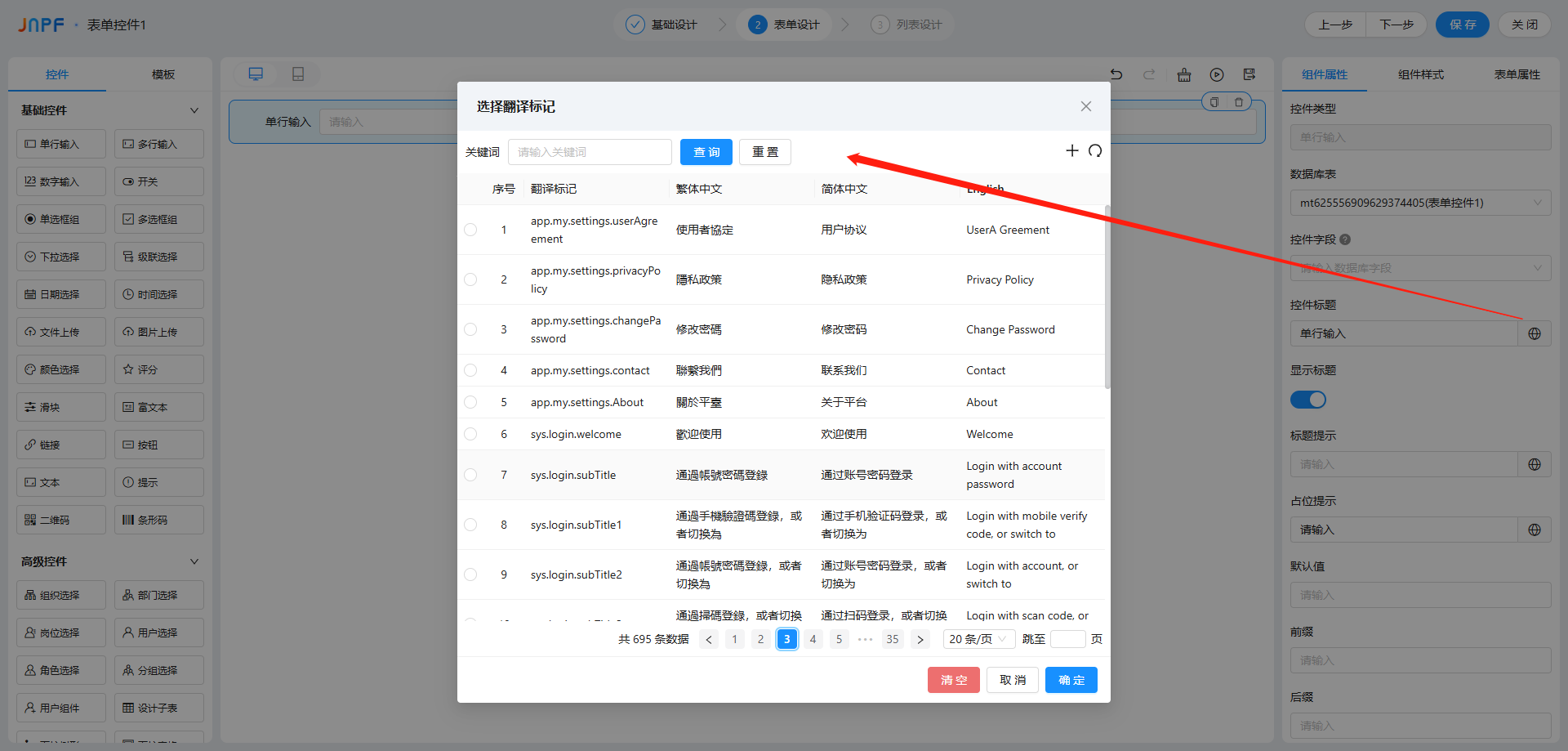 多语言翻译配置后没生效?需在 “选择翻译标记” 中找到对应控件标题的翻译项(如 “姓名” 对应 “sys.form.name”),配置好繁体、英文等翻译后,切换系统语言才会生效,未配置则显示默认中文。
