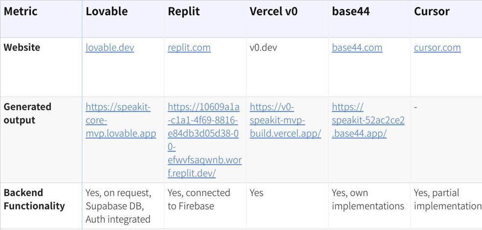 测试工具包括 Lovable、Replit、Vercel v0、base44,以及编辑器类 AI 工具 Cursor Editor 与 GitHub Copilot,另测试 Claude Code。