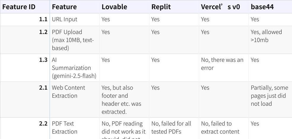 通过上述过程,每个工具都产出了一个应用版本。接下来,我依据一系列客观和主观指标对所生成的应用进行了对比分析: