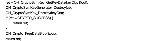 使用 OH_CryptoSymKey_GetKeyData 函数获取生成密钥的二进制数据,并存储在 out 结构体中。然后依次销毁密钥生成器上下文和密钥对象,释放相关资源。最后,使用 OH_Crypto_FreeDataBlob 函数释放存储二进制数据的结构体所占用的内存。