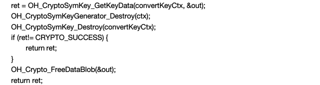 使用 OH_CryptoSymKey_GetKeyData 函数获取转换后密钥的二进制数据,并存储在 out 结构体中。然后依次销毁密钥生成器上下文和密钥对象,释放相关资源。最后,使用 OH_Crypto_FreeDataBlob 函数释放存储二进制数据的结构体所占用的内存。
