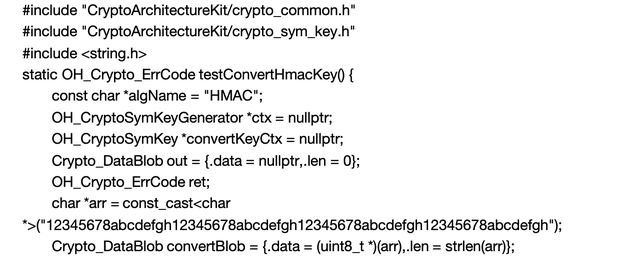 这里定义了一个函数 testConvertHmacKey,创建了一个包含特定字符串(模拟二进制数据)的 Crypto_DataBlob 结构,用于后续的转换操作。
