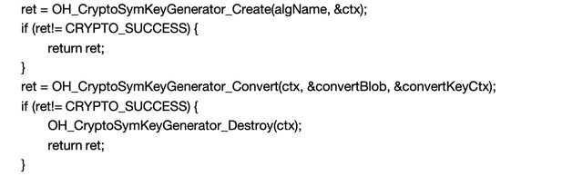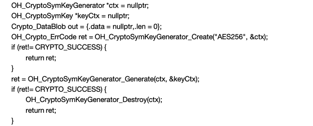 这里首先创建一个 OH_CryptoSymKeyGenerator 类型的指针 ctx 来表示对称密钥生成器上下文,以及一个 OH_CryptoSymKey 类型的指针 keyCtx 来存储生成的密钥。然后使用 OH_CryptoSymKeyGenerator_Create 函数创建一个 AES256 密钥生成器,传入字符串参数“AES256”来指定密钥规格。如果创建成功,接着使用 OH_CryptoSymKeyGenerator_Generate 函数生成对称密钥。在整个过程中,通过检查返回的错误码 ret 来确保操作的正确性,如果出现错误,及时释放已分配的资源。
