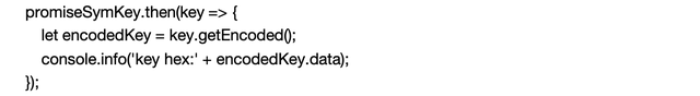 当密钥生成成功后,通过 Promise 的 then 方法获取生成的密钥对象,并调用 getEncoded 方法获取密钥的二进制数据。这里将二进制数据转换为十六进制字符串并输出,以便开发者查看和使用生成的密钥。
