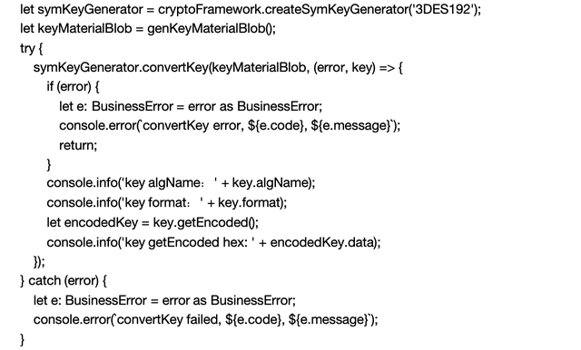 首先创建一个密钥算法为 3DES、密钥长度为 192 位的对称密钥生成器。然后使用 convertKey 方法,传入之前创建的 DataBlob 对象,尝试将二进制数据转换为对称密钥。如果转换成功,在回调函数中获取生成的密钥对象,输出其算法名称、格式以及二进制数据(以十六进制字符串形式)。如果转换过程中出现错误,通过捕获异常并输出错误信息。