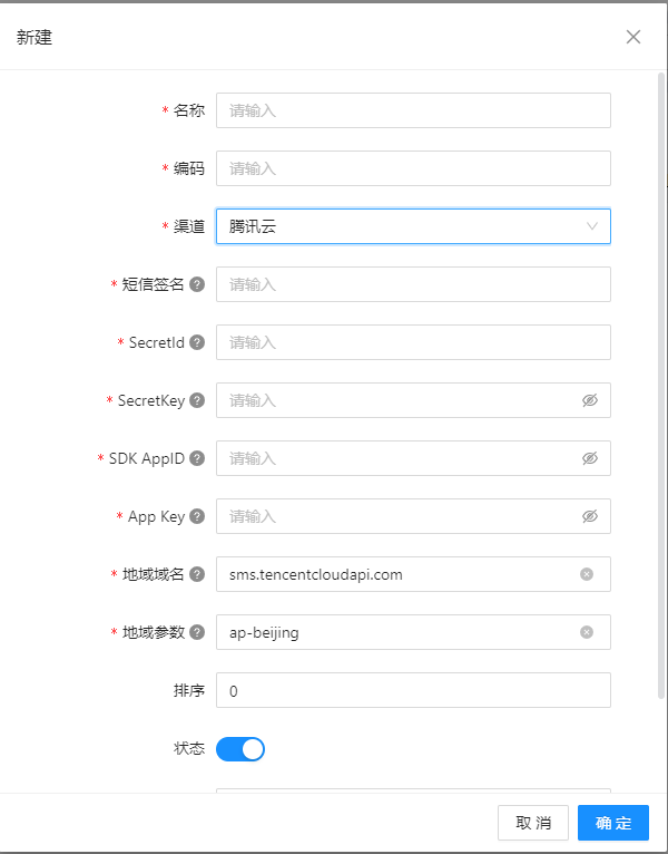 (2)腾讯云 SecretId :腾讯云的 SecretId 。渠道是腾讯云必填,否则隐藏。请在”腾讯云的访问管理-访问密钥- API 密钥管理“页中获得。SecretKey :腾讯云的 SecretKey 。点击【眼睛图标】可以查看输入密码,默认密码用●代替。渠道是腾讯云,必填否则隐藏。请在”腾讯云的访问管理-访问密钥- API 密钥管理“页中获得。SDK AppID:腾讯云的 SDK AppID 。渠道是腾讯云必填,否则隐藏。请在”腾讯云的应⽤管理-应⽤列表“页中获得。App Key:腾讯云的 App Key 。渠道是腾讯云必填,否则隐藏。请在”腾讯云的应⽤管理-应⽤列表“页中获得。地域域名:默认是接⼊地域域名为 sms.tencentcloudapi.com。渠道是腾讯云必填,否则隐藏。默认是国内地域域名,也⽀持指定其它地域域名。地域参数:默认是 ap-beijing。渠道是腾讯云必填,否则隐藏。默认是国内地域参数,也⽀持指定其它地域参数。