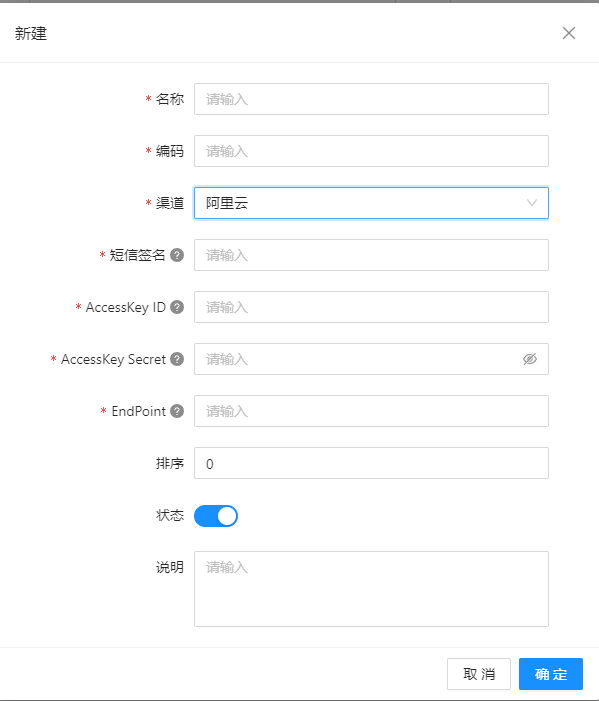 名称:定义账户的名称。编码:定义账号的编码,唯一性校验。渠道:值:阿里云、腾讯云,默认是阿里云。(1)阿里云短信签名:短信服务提供的功能,短信发送时会根据客户的设置,在短信内容里附加个性化签名,再发送给被叫手机客户。AccessKey ID:阿里云的 AccessKey ID。渠道是阿里云必填,否则隐藏。请在”阿里云的 AccessKey 管理-安全信息管理”⻚中获得。AccessKey Secret:阿里云的 AccessKey Secret。点击【眼睛图标】可以查看输入密码,默认密码用●代替。渠道是阿里云必填,否则隐藏。请在”阿里云的 AccessKey 管理-安全信息管理”⻚中获得。EndPoint:阿里云的 EndPoint。渠道是阿里云必填,否则隐藏。请在”阿里云的短信服务-OpenAPI Explorer-Region&Endpoint”⻚中获得。
