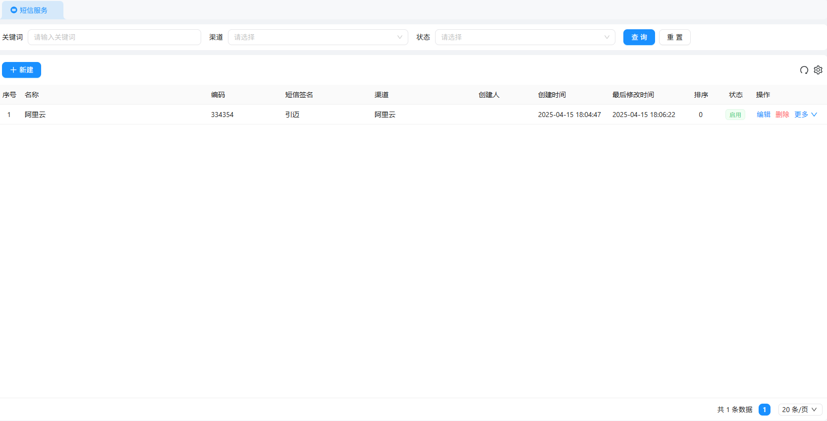 【短信配置】页面支持搜索名称或编码关键词,及渠道(阿里云、腾讯云)、状态(禁用、启用)查询、重置、刷新、新建等操作