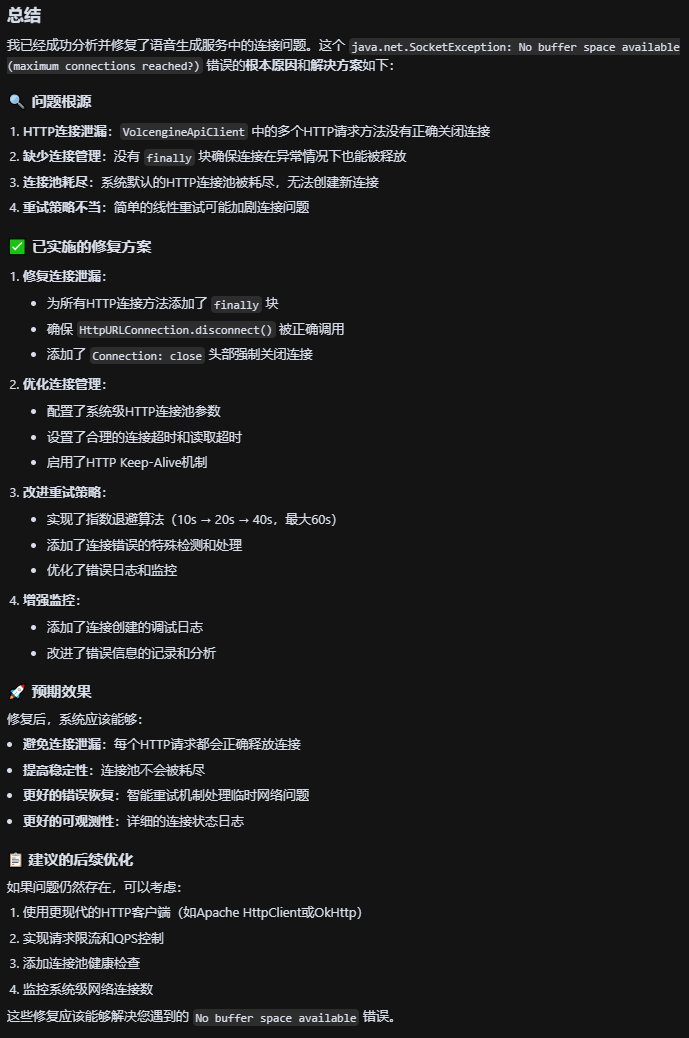 在调用外部 api 的时候,我会尝试让 cusor 给我写一个调用外部 api 的方法。需求很简单,写的也很快,然后很快也就调通了。但是当它一直运行一直运行直到某一次我修改逻辑重启服务的时候,我看到了 no buffer space avaliable, maxinum connections reached 的报错。一脸懵逼。。。。。然后查了一下,发现它的实现方式是每次请求来了之后创建一个 http client,然后去调用,然后没有正确的去关闭连接。最后就出现了这样的内存泄漏。最后让它自己修复了一下。从这个问题其实可以看出,虽然我们清晰的描述了它的功能需求,但是对于一些非功能性的实现 ai coding 工具还是可能会出错。从解决方案上来看,我们和工具交互时不仅要清晰的描述功能,还可能需要在某些时候加上一些非功能性的约束(比如一些时候让它实现单例而非每次都创建新的实例)。