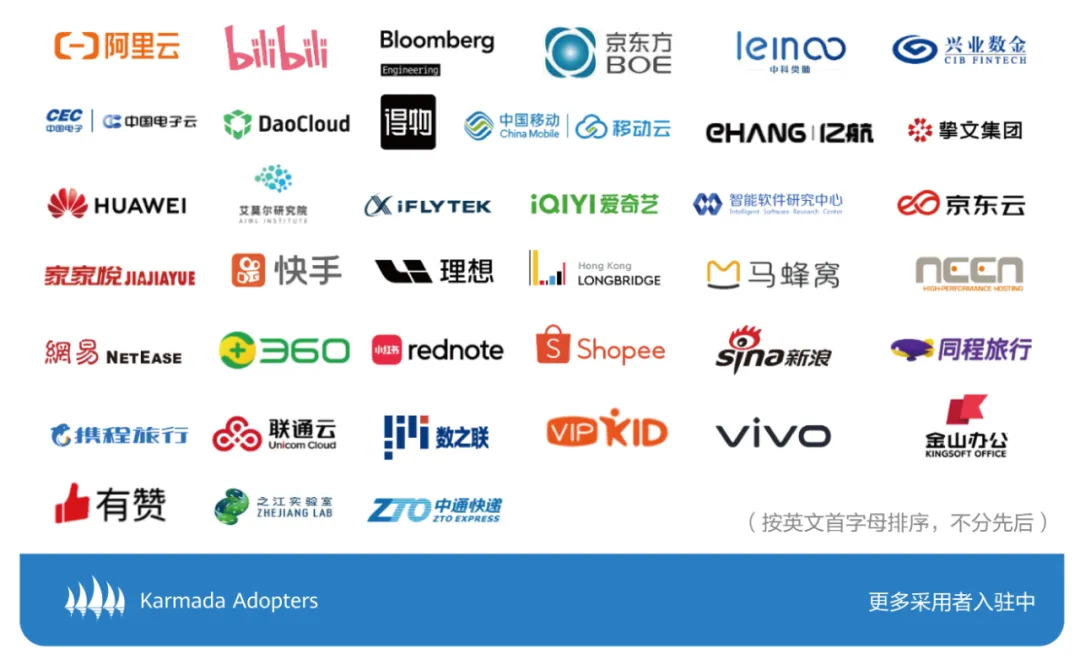 截至目前,Karmada 用户组已吸纳来自全球的 40+家机构和组织。更多使用场景及案例研究请查阅:https://karmada.io/adopters