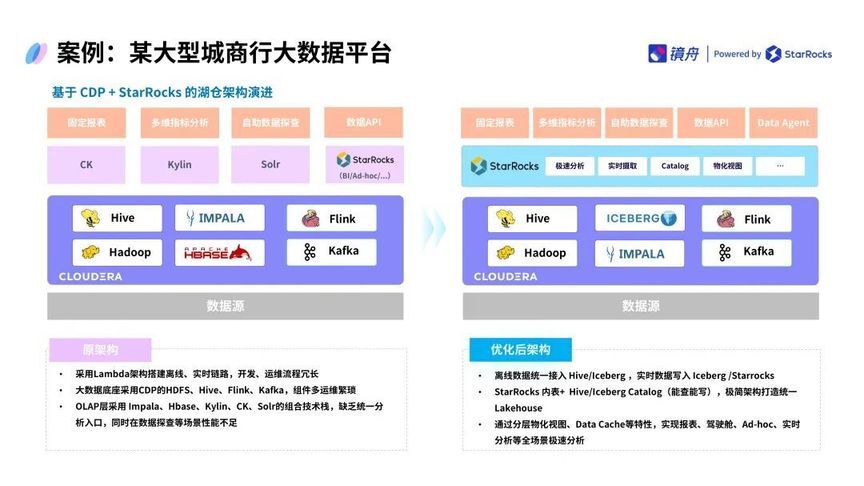 该行原有的经典 Lambda 架构组件繁多、维护成本高昂,多套 OLAP 引擎并存导致数据孤岛问题严重。通过引入 StarRocks 作为统一分析引擎,替代了 Impala、HBase、Kylin 等多套系统。利用 StarRocks 直接分析内表与 Hive/Iceberg 外表,并借助物化视图等特性进行全场景加速。数据架构与 Pipeline 极大简化,运维成本显著降低,报表、驾驶舱、探查分析等所有应用均实现了极速响应。