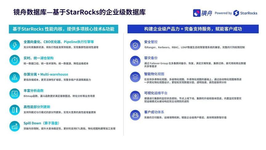 作为 StarRocks 开源项目在中国的主要贡献者和推广者,镜舟科技深知企业级客户对稳定性、安全性及专业服务的更高要求。通过企业版产品镜舟数据库,在 StarRocks 内核能力的基础上,增加了安全管控、灾备、可视化运维等企业级功能,致力于帮助更多企业构建卓越的数据分析系统,共同拥抱数据驱动的智能未来。