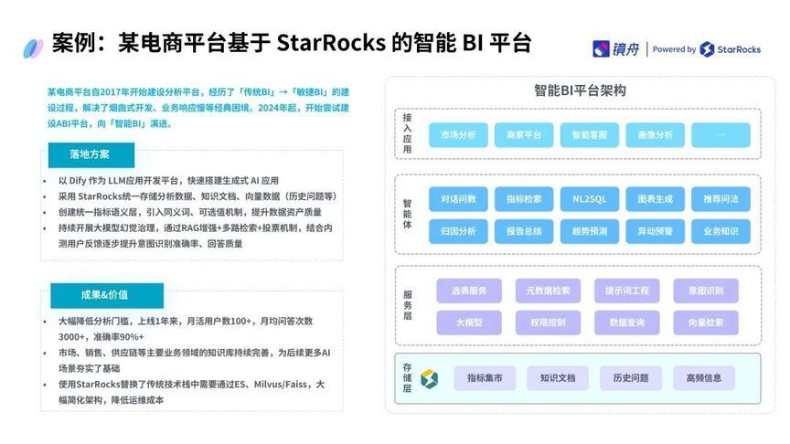 该电商平台希望从“敏捷 BI”向“智能 BI”(ChatBI)演进,但面临技术栈复杂、多模态数据检索困难等问题。项目最终选用 StarRocks 作为统一数据底座。它不仅承载指标查询,同时凭借其内置的文本与向量检索能力,统一替代了原有的 ES 和 Milvus,简化了平台技术栈。该智能 BI 平台上线一年来,月活用户超百人,月均问答超 3000 次,准确率高达 90% 以上,有效降低数据分析门槛。