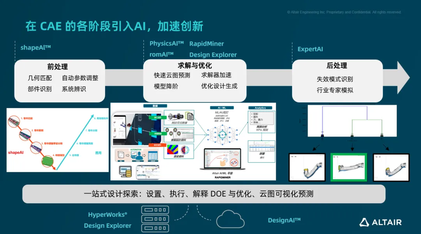 Altair 的 AI 模块已深入前处理(ShapeAI 几何识别)、建模优化(PhysicsAI、romAI)、后处理(ExpertAI 失效识别)等环节。这些技术并非独立运行,而是原生嵌入至仿真流程之中,避免工具割裂,提高整体协同效率。