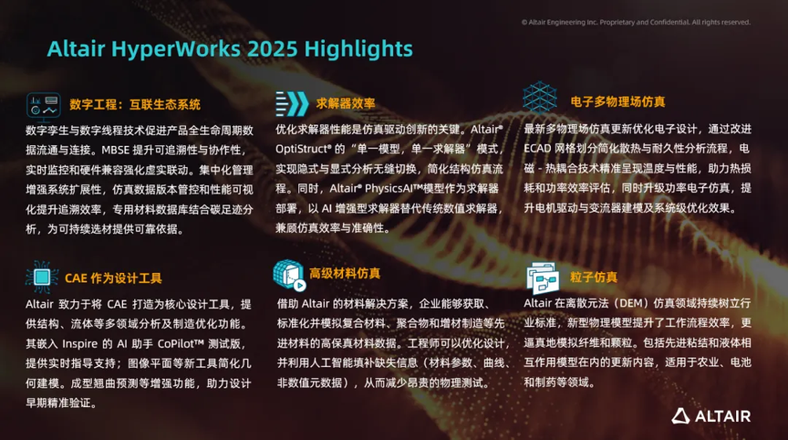 从更广阔的视角来看,工业界正出现两个明显趋势:仿真正加速前移至概念设计阶段,在早期决策中发挥主导作用;同时也在验证阶段快速替代部分物理试验,成为产品可靠性保障的重要支柱。Altair 始终坚持“仿真驱动设计”的理念,在多个行业实践中推动仿真真正嵌入设计流程与思维体系。