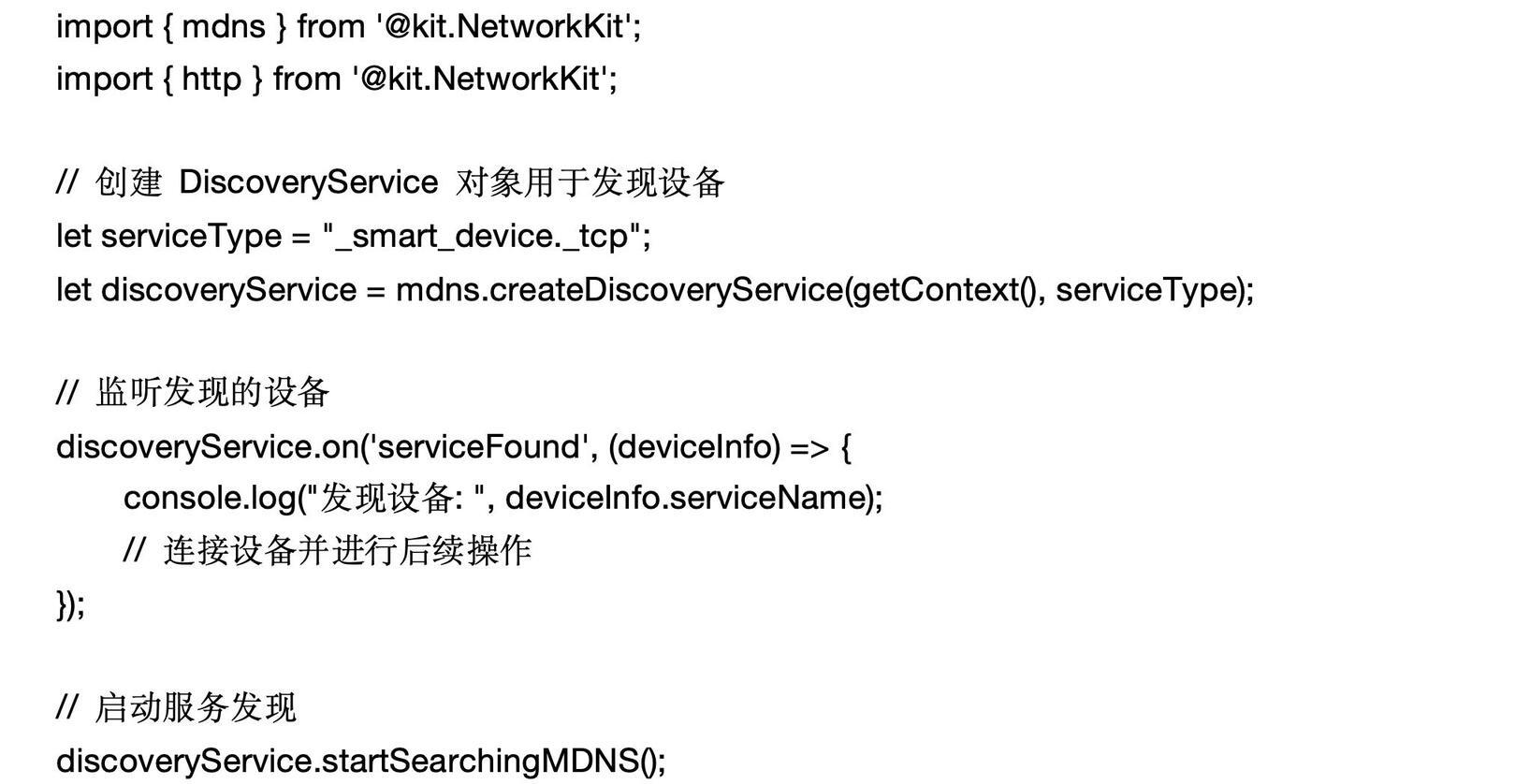 在上面的代码中,DiscoveryService 对象用于在局域网内发现指定服务类型的设备,连接建立后,我们可以通过 serviceFound 事件监听到发现的设备。