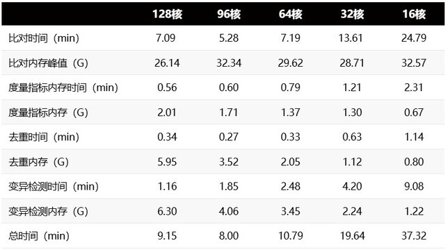 使用本文流程对水稻全基因组测序数据进行变异检测分析,下表为不同 CPU 核数下的计算时间和资源调用情况: