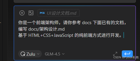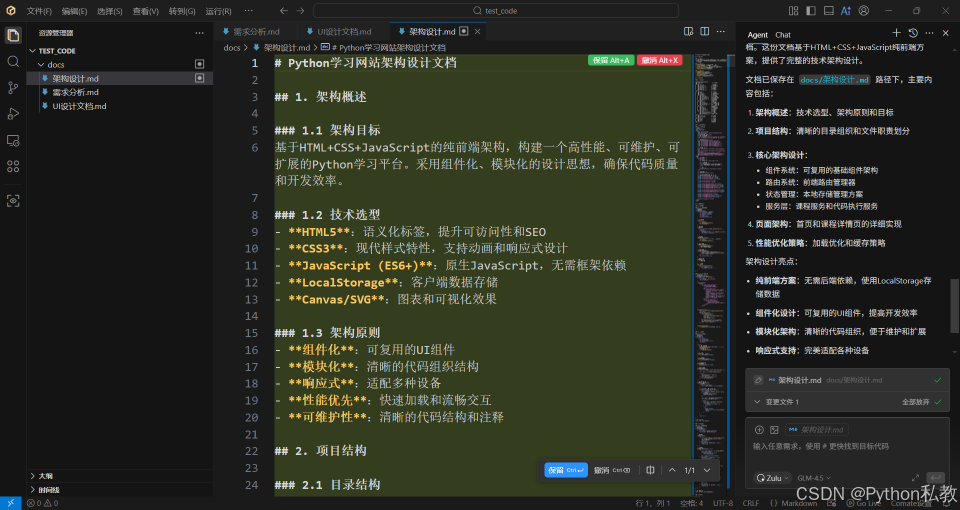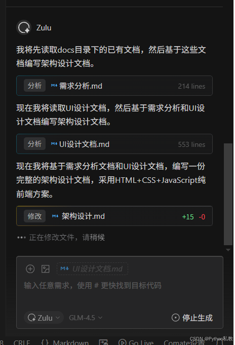 接下来让 Comate 充当架构师角色,编写架构设计文档。当前采用纯前端架构,后面可以结合 Django 框架或者 Flask 框架进行重构和升级。把提示词给 Comate,文档从编写到完成很快捷~