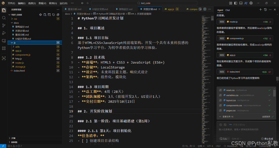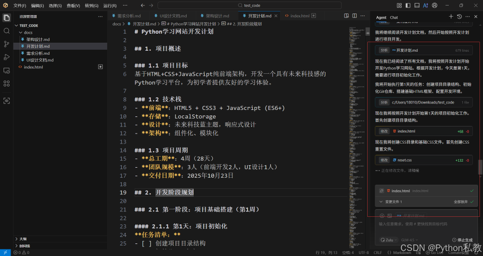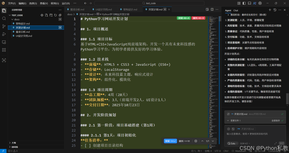 基础文档准备好以后,就需要进入开发阶段了~为了保证项目的有序进行,让 Comate 充当项目 Leader,制定一个详细的开发计划。提示词如下:你是一个项目 Leader,请参考 docs 目录下的文档,编写 docs/开发计划.md 文档,制定详细的开发计划。